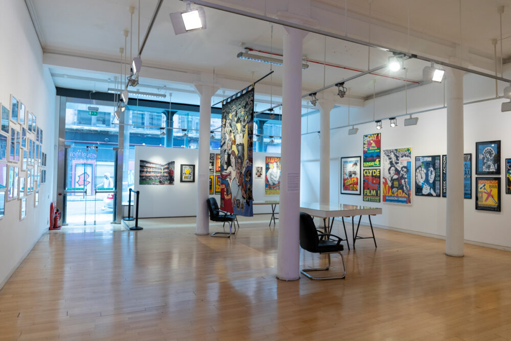The exhibition also includes large-scale screen-printed posters created by Alistair McCallum and Jane Carroll at Cranhill Arts appeared around Glasgow in the same era as the community imagery. The colourful posters covered campaigns, protests and benefit gigs and help to give context on the social climate and culture of that period.